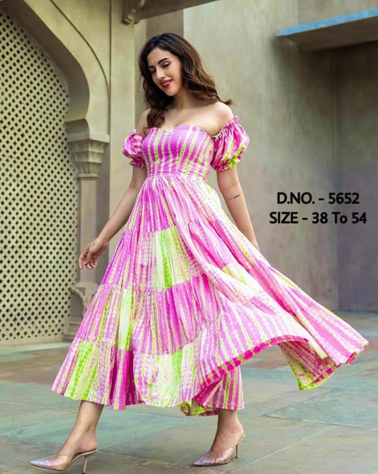 Heavy Mulmul Tie & Dye Long Gown Kurti with Frill Sleeves