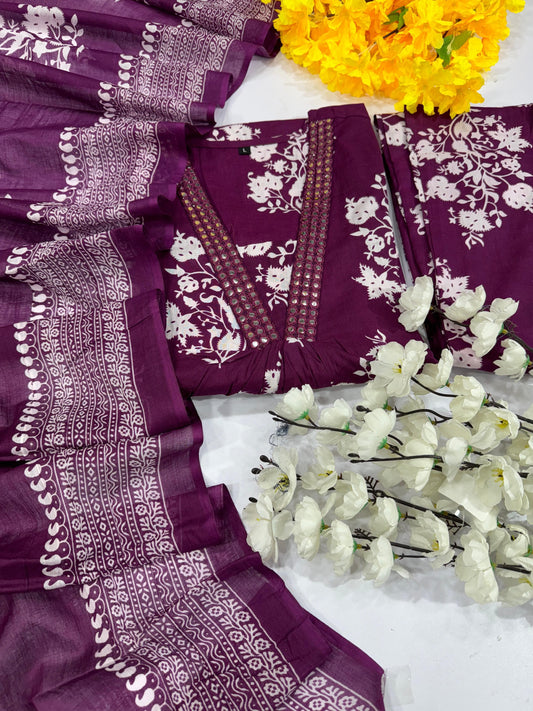 Flared Printed Cotton Cambric Suit Set with Dori & Tussels and Mulmul Dupatta