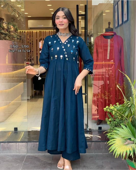 Heavy Rayon A-Line Kurti with Katha Work and Stylish Pants